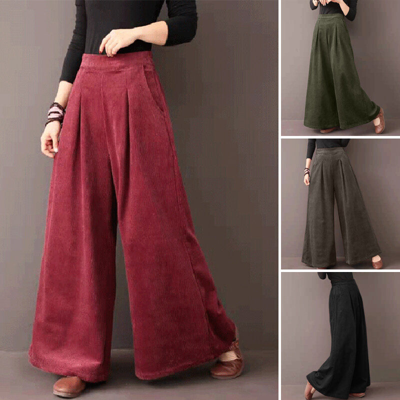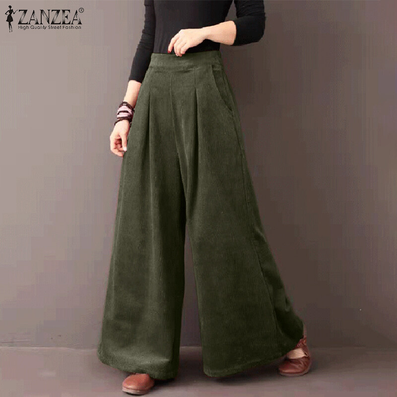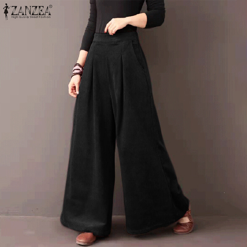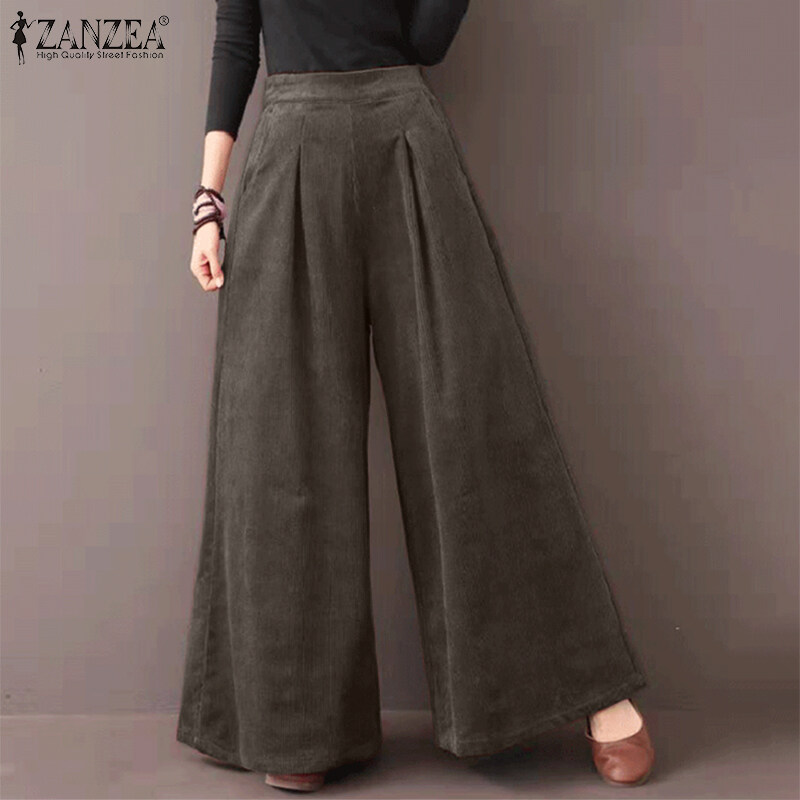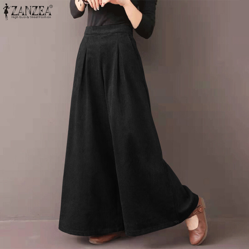 ZANZEA Womens Flare Wide Leg Pants Casual Corduroy Culottes High Waist Trousers