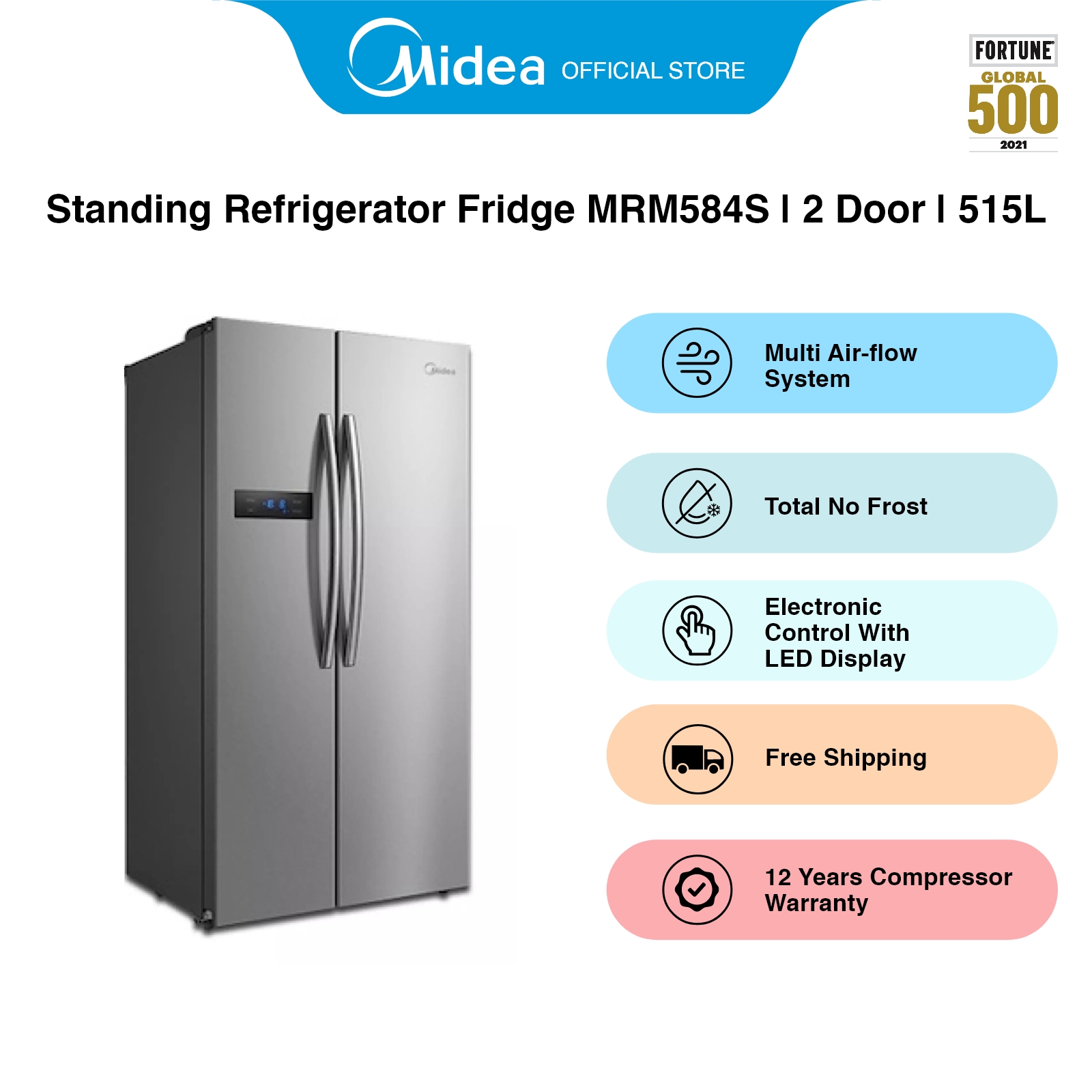 [Bulky] Midea MRM584S Silver Side by Side Refrigerator, 515L, Energy Rating 2 Ticks