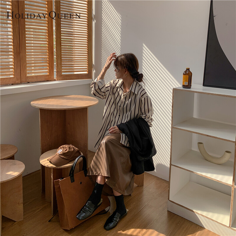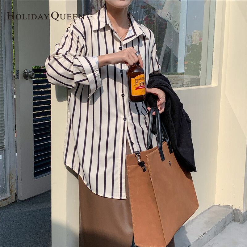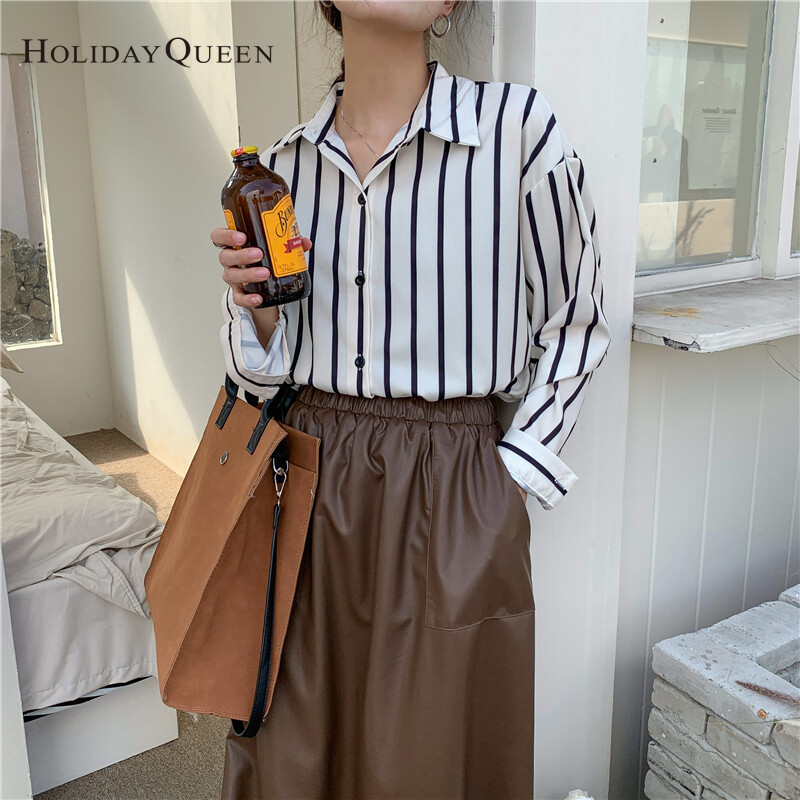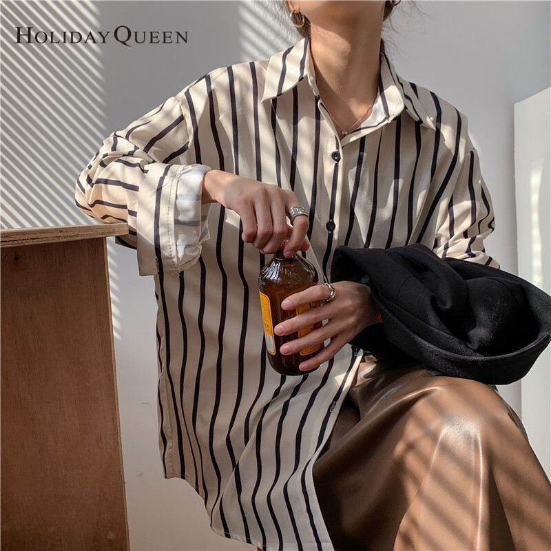 HolidayQueen French All-match Long-sleeved Striped Shirt Women's Design Sense Niche Early Autumn Temperament Tops Lazy Hong Kong Flavor S M L XL Free Shipping HQ1030