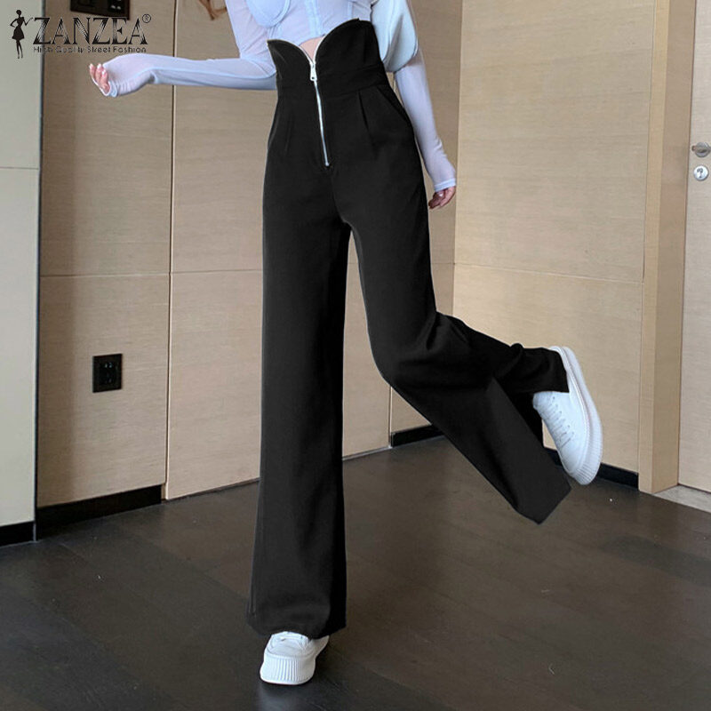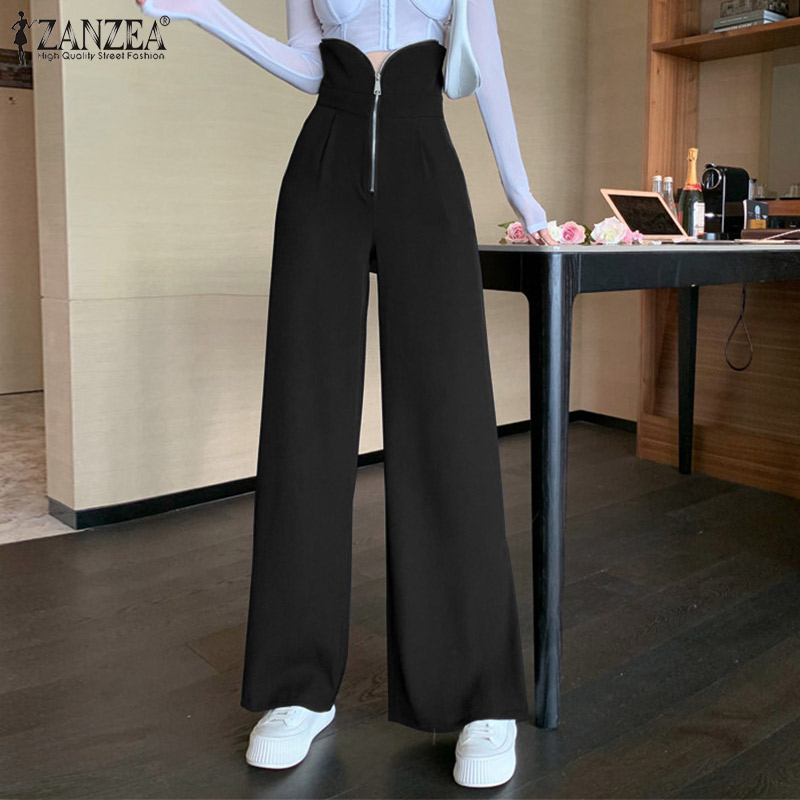 ZANZEA Womens Fashion Wide Leg Plain Pants Zipper High Waist Baggy Split Long Trousers