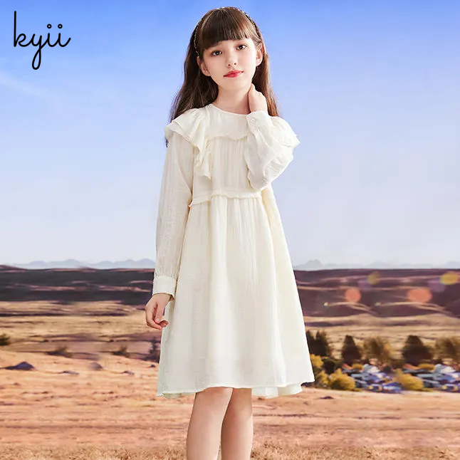 KYII Kids Girls Summer Round-neck Dress Casual Loose Long Sleeve Dress kyii0046