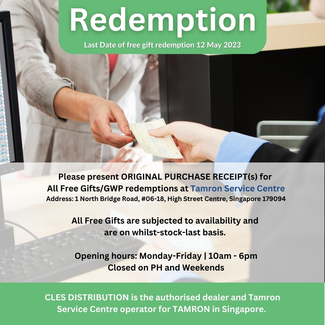 Redemption venue: Tamron Service Centre, 1 North Bridge Road, #06-18, High Street Centre, Singapore 179094
