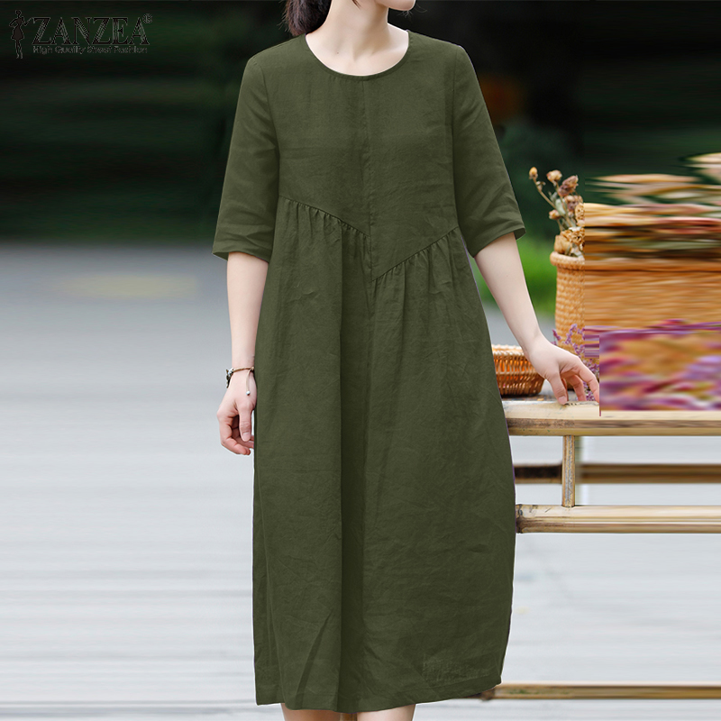 ZANZEA Women Leisure Cotton Pleated Short Sleeve Midi Dresses Bohemian Round Neck Sundress #8