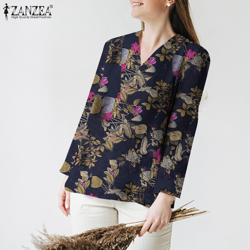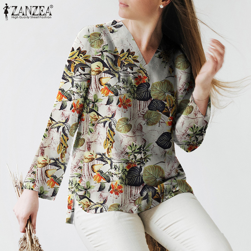 ZANZEA Womens Long Sleeve V Neck T Shirt Splid Hem Casual Holiday Cotton Linen Blouse #12