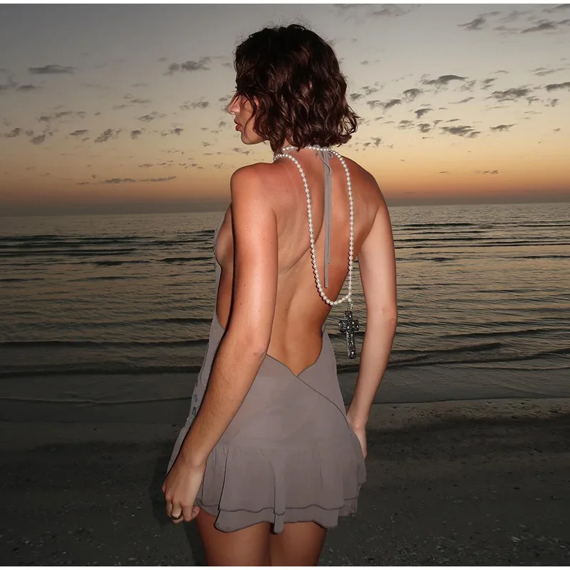 Sexy Sequin Dress Women Halter Lace Up Sleeveless Backless Ruffle A-line Mini Dresses Female 2025 Spring Summer Chic Lady Robe